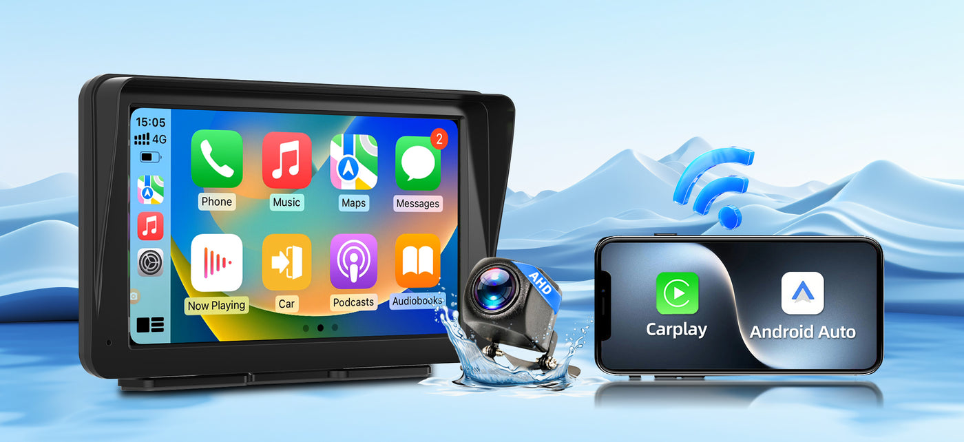 • 📱 7'' HD Touchscreen – Full-screen phone sync & 1080P videos.