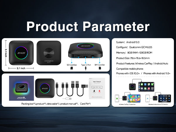 - Android 13, 8GB RAM + 128GB ROM: Wireless CarPlay Adapter AI Box runs on the latest Android 13 operating system. It features a powerful 8+128GB configuration, giving you plenty of room to install apps, store music and videos, and more. The Multimedia Video Box uses the newest technology to ensure smooth and reliable performance. Whether you're streaming music, watching movies, or using navigation, Wireless AI Box CarPlay and Android Auto delivers seamless and reliable performance every time.