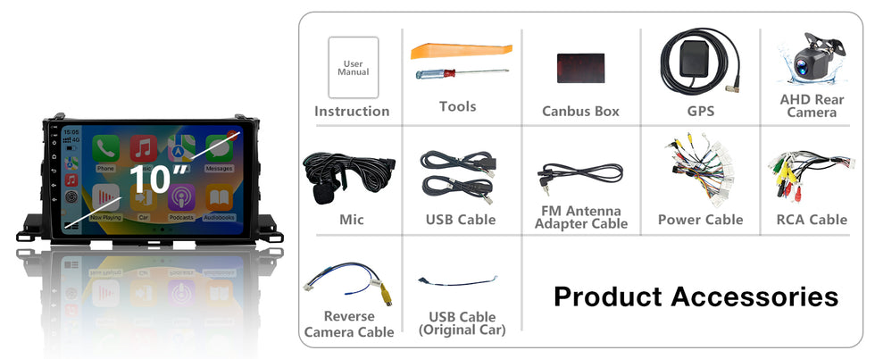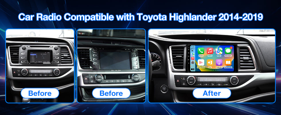 - 1.Compatible with Toyota Highlander 2014-2019 Car stereo:touchscreen radio,quad-core,coretex‐A5,frequency up to 1.5GHZ,2GB RAM+32GB ROM memory.Main feature:Carplay+Andriod Auto/AM/RDS+Bluetooth+WIFI Receiver+GPS Navigation+DSP+Front/Rear View Image Input+SWC+Mirror Link etc.