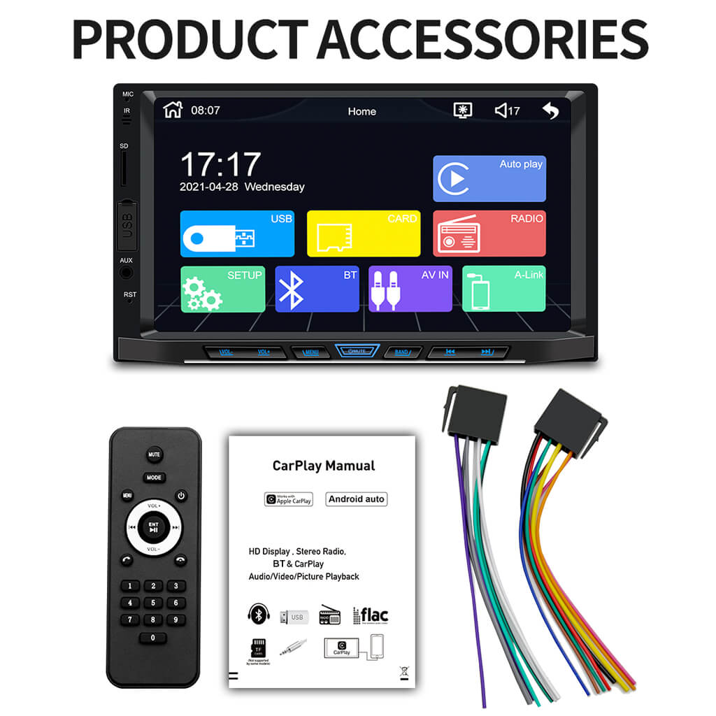 【7 Inch Touch Screen Stereo】This head unit is a universal Binize double din carplay, standard harness, easy to install.1024*600 screen resolution, support phone online navigation,seven-color key backlights adjustable, Please confirm whether it matches the installation slot of your car before buying.