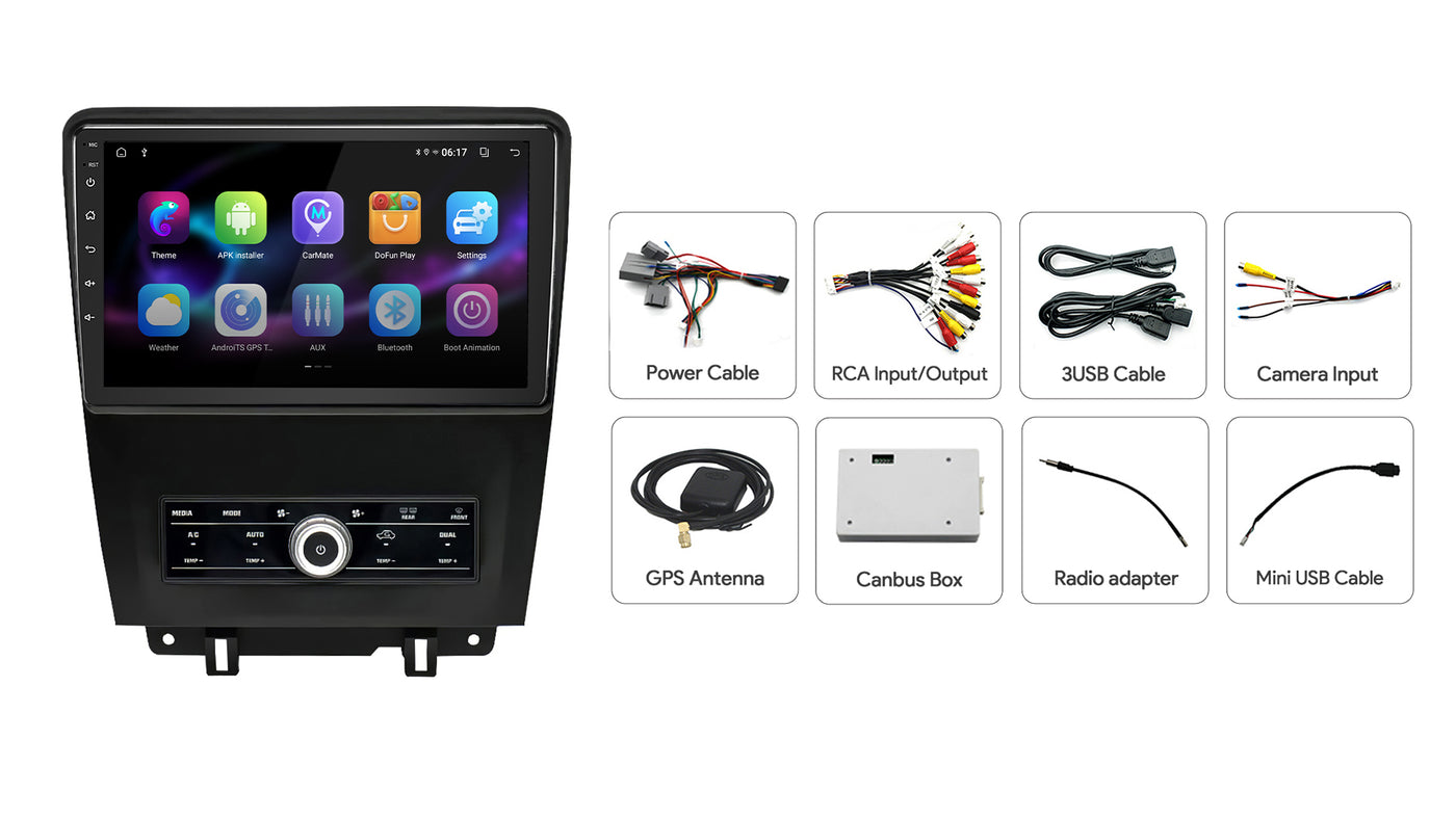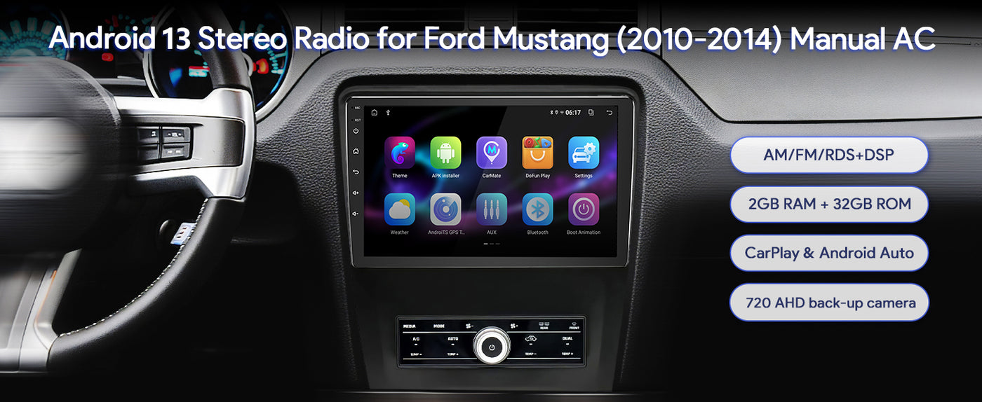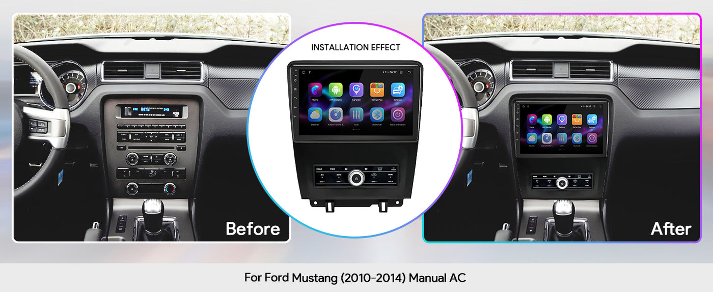 This stereo is compatible with Ford Mustang models from 2010–2014, and only fits vehicles with Manual AC. Please confirm your center console shape and size before ordering. If unsure, feel free to contact us with photos.