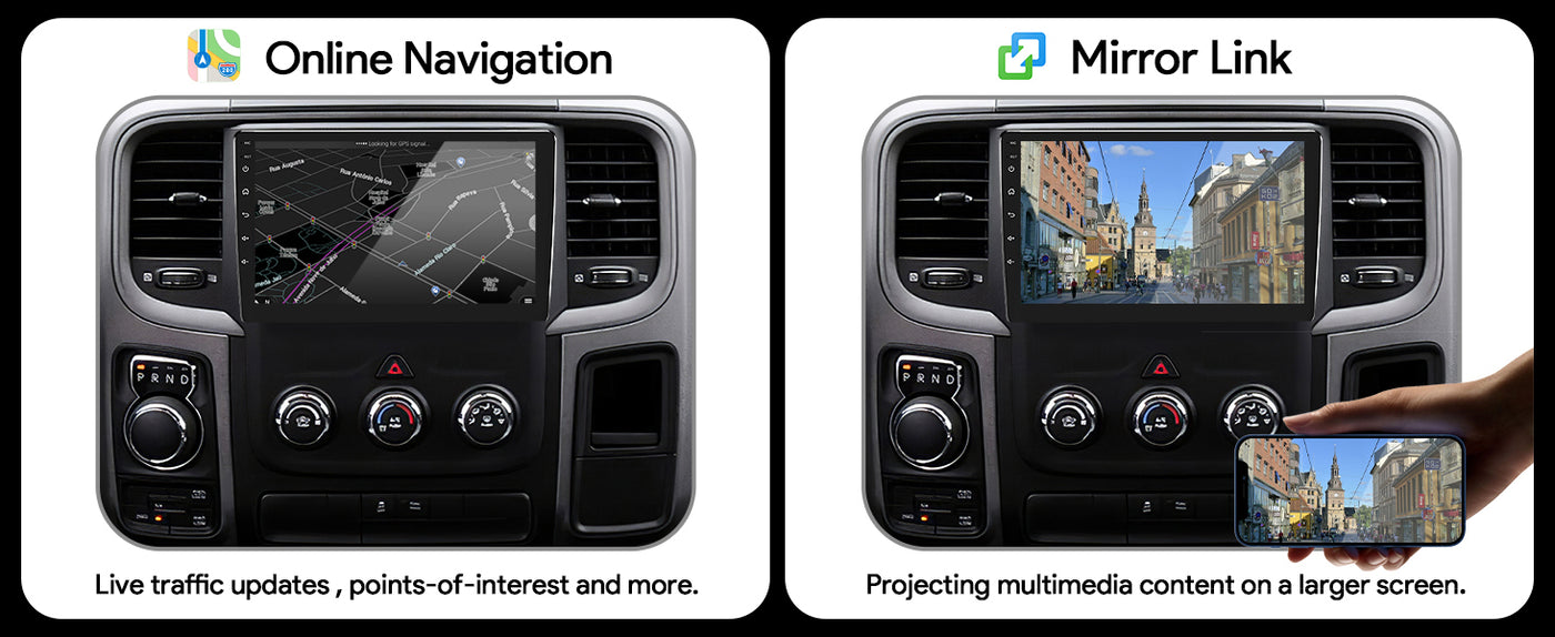 - 【Compatible with Dodge Ram 1500 2500 3500 Radio 2013-2018】Stay ahead of the curve with the latest and greatest in-car entertainment technology! Our 9.7 inch touchscreen car radio is powered by the newest Android system and a 4-core processor, giving you a smooth and responsive experience that feels like using your smartphone. Compatible with Dodge Ram 1500 2500 3500 Radio 2013-2018. Note: not for car models with original 9.4" screen.