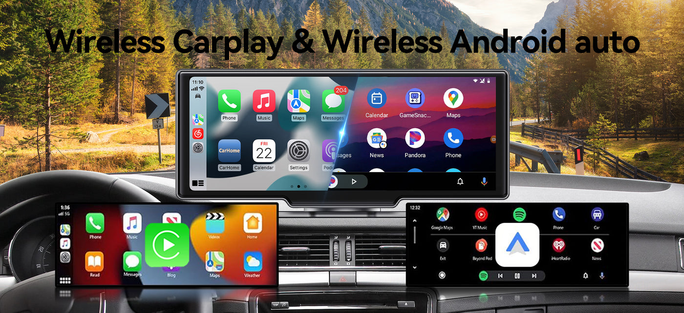 - 【Wireless Apple CarPlay & Android Auto】 This carplay screen for car is fully compatible with Apple CarPlay & Android Auto. Connect your smartphone via Bluetooth and Wi-Fi, access calls, maps, apps, AUX, speakers, and GPS navigation with ease. Voice control via Siri or Google Assistant allows you to make hands-free calls, play music, navigate maps, and read messages, offering a safer and more convenient driving experience.