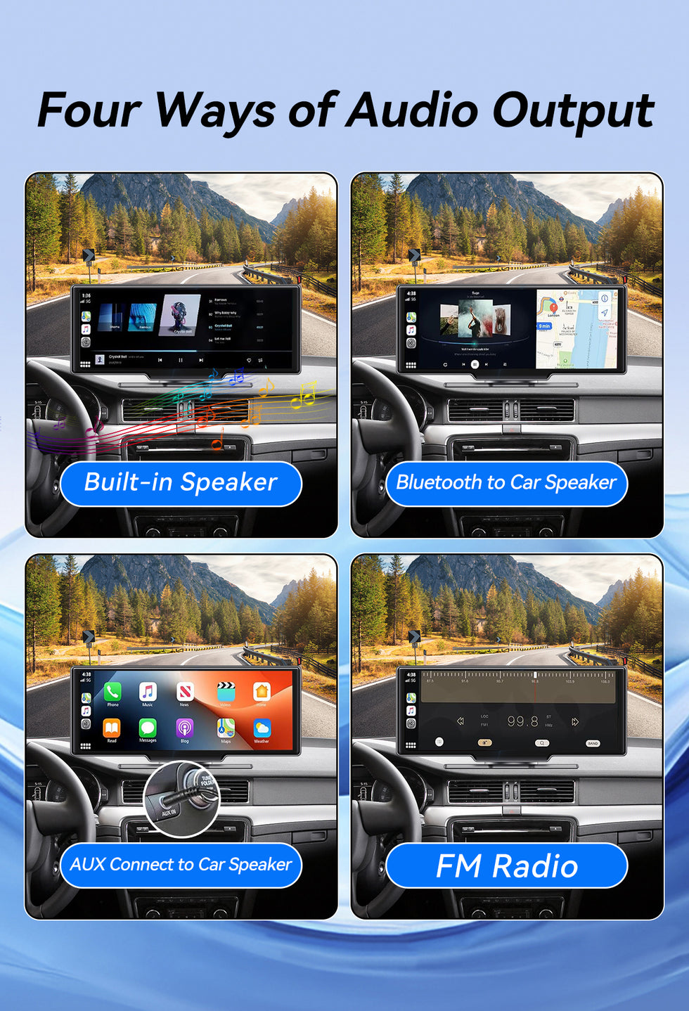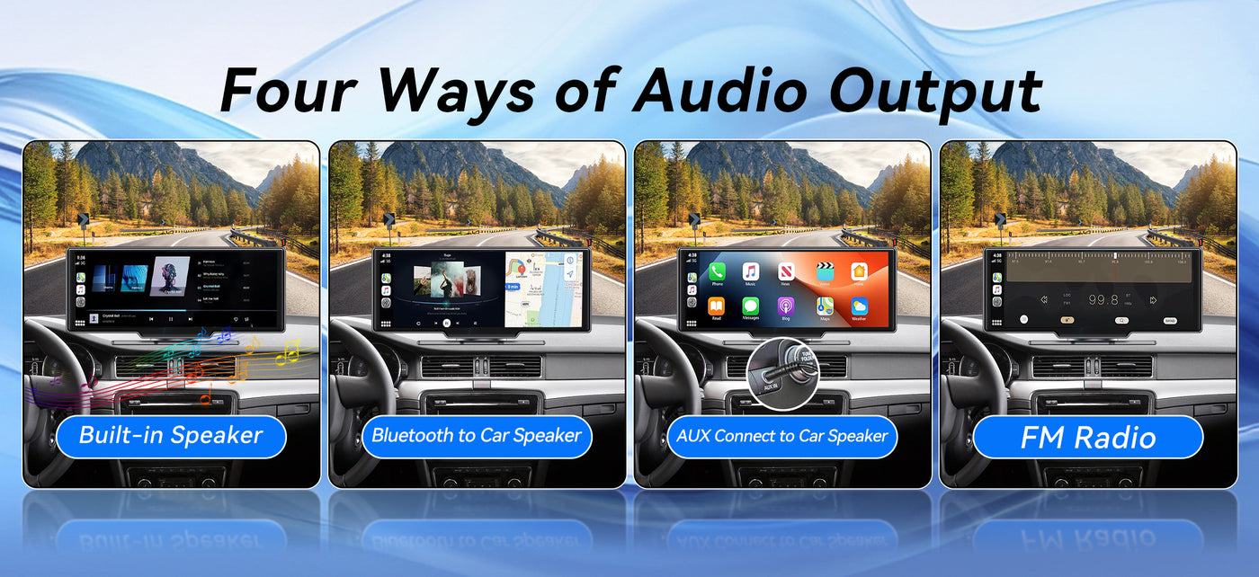 - 【Multiple Audio Output】 This double din car stereo allows wireless audio transfer via Bluetooth to in-car speakers for amazing stereo sound. Also supports AUX, FM Transmitter, and built-in carplay speaker, giving flexible audio options to enjoy your favorite music and content.