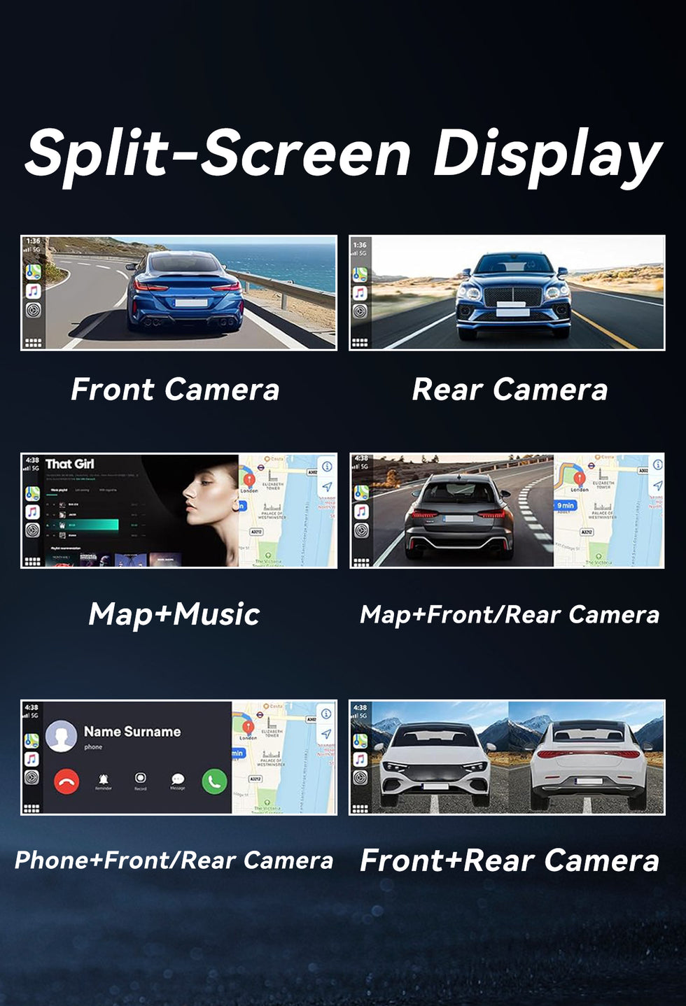 - 🔄 Backup Camera – Safe reversing with night vision.